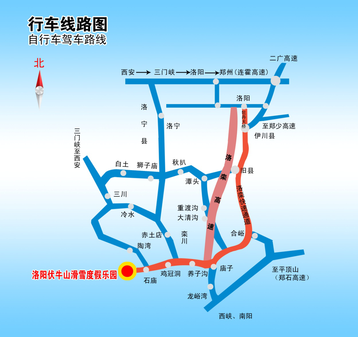 洛陽-嵩縣-欒川縣城-欒川石廟鎮-滑雪場(140公里)。2、鄭州-新密-登封-伊川-嵩縣-欒川縣城-欒川石廟-滑雪場(260公里)。