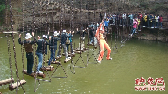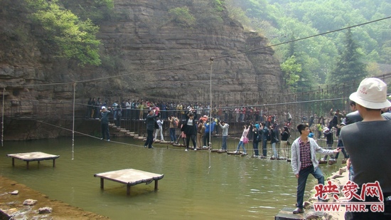 盡管鄭州的天氣忽冷忽熱還時不時的狂風大作,但是在這里天氣卻晴朗明媚,溫度也正好適宜外出游玩。當然,玩的嗨才是最關鍵的!景區內除了誰都不會錯過的風景名勝外還有很多有趣的娛樂項目:比如過吊索:看起來簡單的吊索其實需要有很好的體力和身體協調力,一不留神就可能狼狽的掉入半米深的池水中。還有劃沖鋒舟,非常考驗團隊的協作。不過最好玩的卻是在大巴車上,“樂活”的工作人員們把最自己具特色的電臺節目“知道不知道”搬上了大巴車,并邀請了電臺的明星主持亞楠來與大家互動,把無聊的旅途變得趣味橫生。
