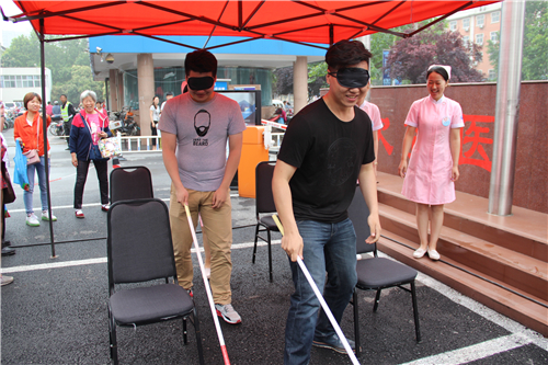 義診活動現場,還舉行盲人體驗活動,邀請市民戴上眼罩模擬盲人參加各種游戲,以體驗健康視力的寶貴。