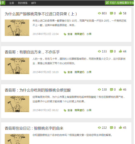 自媒體,以“香菇哥”的名義在各個自媒體平臺申請入駐,最先申請的是搜狐媒體平臺,運作的這幾個月,搜狐上的累計閱讀量目前已達到16萬。后來又申請了今日頭條,一點咨詢,鳳凰新聞媒體平臺等渠道。也建立了自己的微信公眾號。目前所有的宣傳渠道的累計閱讀量已經突破了七十萬。就是在這些渠道上宣傳自己的創業故事以及大山里面的人文風情來傳播。