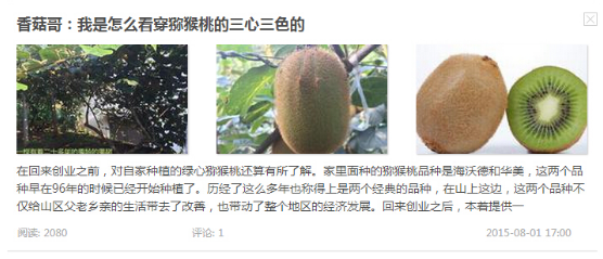 通過這些文章的傳播,我認識到了很多的朋友,這些朋友也給我提供了很多的幫助,通過他們我開拓了視野,對獼猴桃有了更加深刻的了解。這些幫助都來自于這些文章的宣傳。雖然有時候晚上熬夜到凌晨的兩三點,但是我覺得正是這份辛苦,讓我更加體會到創業帶來的精神上的收獲。