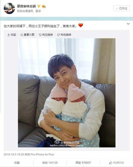 12月5日,林志穎發(fā)微博宣布自己又有了兩個(gè)兒子,眼神里滿(mǎn)是父愛(ài)。陳若儀完勝那個(gè)睡了偶像的妹子好不好,她直接給偶像生了三只猴子!哦不,是三個(gè)兒子。