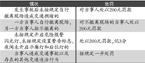 即日起,交管部門將依法加強對“發生輕微交通事故后,未按照規定自行撤離現場”的交通違法行為的處罰力度,輕微事故發生后撤離不及時致堵將被罰款200元,如果未按規定開啟危險報警閃光燈等,將處以200元罰款,記3分。交管部門表示,對應挪車不挪車的事故當事人“當罰必罰”。