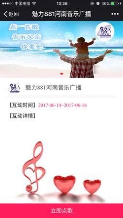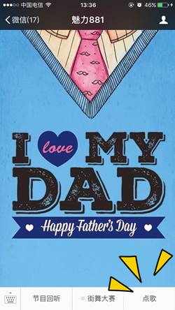本周日就是父親節了。平時向爸爸們表達情意的機會可能不多,趁著節日,你可別落下。特意給親愛的老爸準備了一份禮物,6月14日——6月16日,點擊菜單欄中的“點歌”或直接點擊本文底部的閱讀原文,進入點歌互動頁后點擊“立即點歌”,填寫并提交姓名、手機號、所點歌曲名稱、以及你想對父親說的話。
