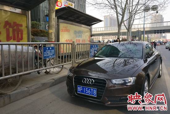 下午3時許,記者在花園路國貿360商場門前的公交站牌看到,多輛出租車和私家車將整座公交站停滿,而公交車迫于無奈只能在路中間停靠。一輛車牌號為豫AS578W的機動車司機在民警的勸說之下駛離了公交站,而另一輛車牌號為豫PI56T8的機動車同樣停在公交站,因車內無人,民警對其進行了處罰。