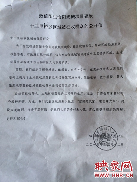 浉河區政府下達的征收公開信   吳彥飛 攝