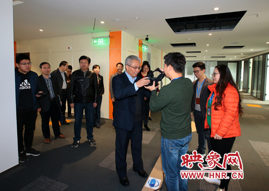 在映象網VR體驗區,易滌非一行還饒有興致的戴上VR眼鏡,親身體驗了由映象網和河南城市VRAR研究院合作開發的HVR互動體驗系統,并對映象網的這一場景式互動創新體驗給予肯定。