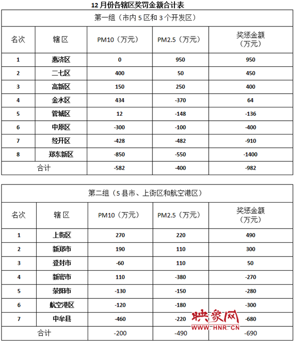 PM2.5排名倒數第一并且被黃牌警告的轄區為:經開區2次、鄭東新區3次。
