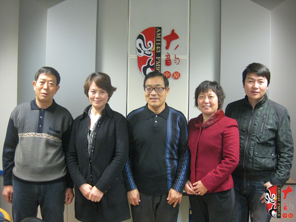 (左起):梓軒藝術團主任聶衛國、副團長兼主要演員李風莉、團長李春友、主任魏桂愛和著名戲曲節目主持人戲曲廣播“當家小生”月陽在直播間