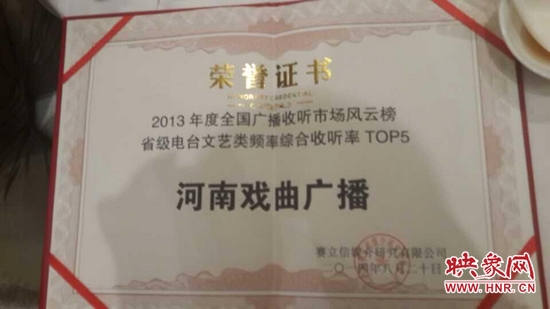2014年8月20日晚上,國內知名廣播收聽率調查公司賽立信媒介研究有限公司在成都舉行發布會,授予河南電臺戲曲廣播娛樂976“2013年度全國廣播收聽率TOP5”榮譽稱號。