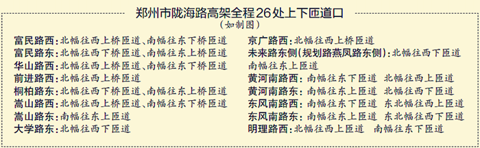 需要注意的是,由于地面一層、部分立交及上下橋匝道尚未完工,還不能完全發揮分流疏導的作用,高架開通后,嵩山路、大學路、京廣路、未來路、黃河南路、東風南路、明理路等下橋匝道車流會增大,給地面交通帶來沖擊,在部分區域可能會出現交通擁堵,到時可能會出現上橋容易下橋難的情況。