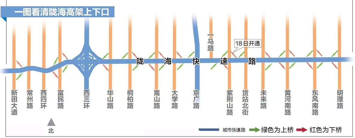 在本月6日,隴海路紫荊山路南側(cè)由西向東上橋匝道、隴海路錢(qián)塘路北側(cè)由東向西下橋匝道也已開(kāi)通。