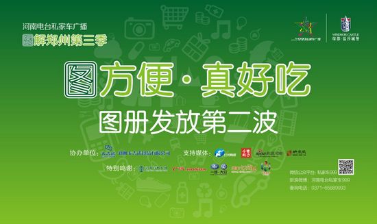河南電臺私家車廣播2013大型公益系列活動——“圖解鄭州”第三季圖方便·真好吃,圖冊發放第二波于2013年7月7日在鄭州市東風路與天明路交匯處的天旺優庫和商都路與七里河南路交匯處的華豐燈飾界免費發放。