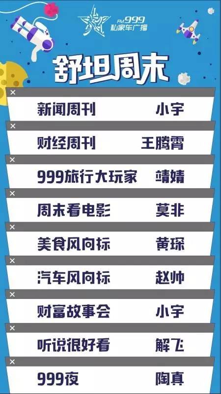 新聞周刊、財經周刊、財富故事會、聽說很好看、美食風向標、汽車風向標……周末的生活,就得這么舒坦,就得這么輕松有料。短小趣味的節目,不同屬性的內容,你要音樂,還是資訊,我們這里全部都有。