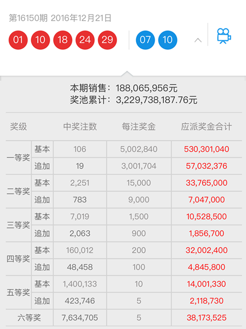 北京時間2016年12月21日晚,體彩大樂透第16150期開獎,開獎號碼前區為“01、10、18、24、29”,后區開獎號碼為“07、10”。河南彩民喜獲4注頭獎,其中1注追加頭獎,分別出自:鄭州(基本2注)、開封(基本1注)、三門峽(基本1注追加1注)。