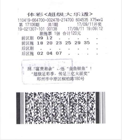 王先生的中獎彩票是一張120元的前區2膽6拖后區3碼的膽拖票。