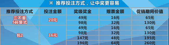 贈票活動不限投注方式,單式、復式、組合如中獎均可贈票。采用復式組合投注,獎金有可能會翻2倍、3倍或4倍,是真正的獎金會翻倍的彩票,尤其是現在活動升級,贈票金額翻倍,獎金更高更超值。