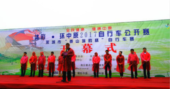 9月27日,以“全民健康,綠色中原”為宗旨的“體彩·環中原2017自行車公開賽--永城市泰山瑞豹杯自行車賽”在河南省永城市日月湖畔舉行。河南省自行車運動管理中心書記李健、永城市人大常委會副主任駱本京、永城市人民政府副市長吳英杰、永城市教育體育局副局長趙海濤等相關部門負責人以及來自國內外600多名運動員和多家媒體參加了啟動儀式,啟動儀式由永城市政府辦公室副主任杜平主持。