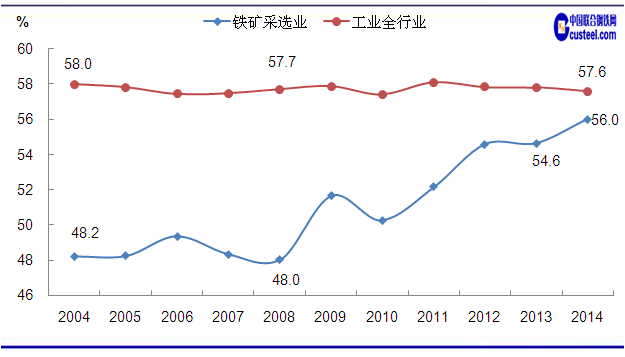 圖4 2004-2014年鐵礦采選業(yè)及工業(yè)全行業(yè)資產(chǎn)負債率變化走勢 數(shù)據(jù)來源:中國統(tǒng)計局