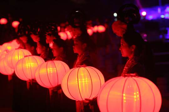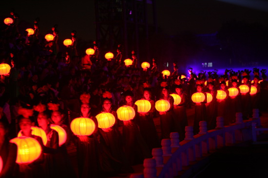 尾聲時,伴隨著一曲《水調歌頭》,寄托大家心中的美好,這時,無數盞紅色燈籠由少女們舉過頭頂,緩緩步入舞臺中央,形成一個巨大的月亮造型,柔和、寧靜,與遠處的廊橋樓閣共同組成一幅壯觀的景象,令人回味悠長。