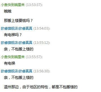 據(jù)小編調(diào)查發(fā)現(xiàn)(如下圖),部分商家表示免費(fèi)送貨,但卻不送上樓,上樓需要額外支付搬運(yùn)費(fèi);也有部分商家是按樓層高低收費(fèi),如:三樓以下不收“上樓費(fèi)”,三樓以上,收費(fèi)按樓層高度遞增。這個(gè)問題消費(fèi)者一定要與客服交流清楚,否則商品運(yùn)來了,還要掏錢才能進(jìn)屋,或者要自己動(dòng)手搬,麻煩就大了。