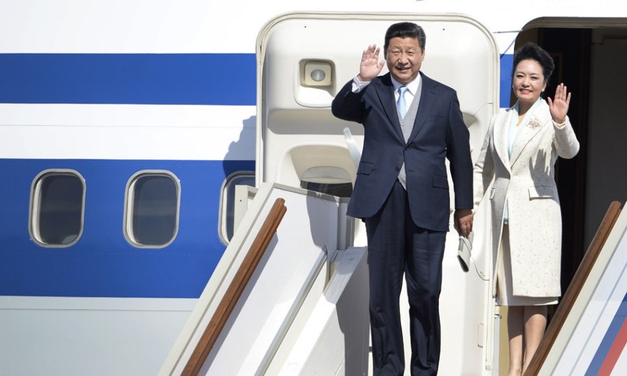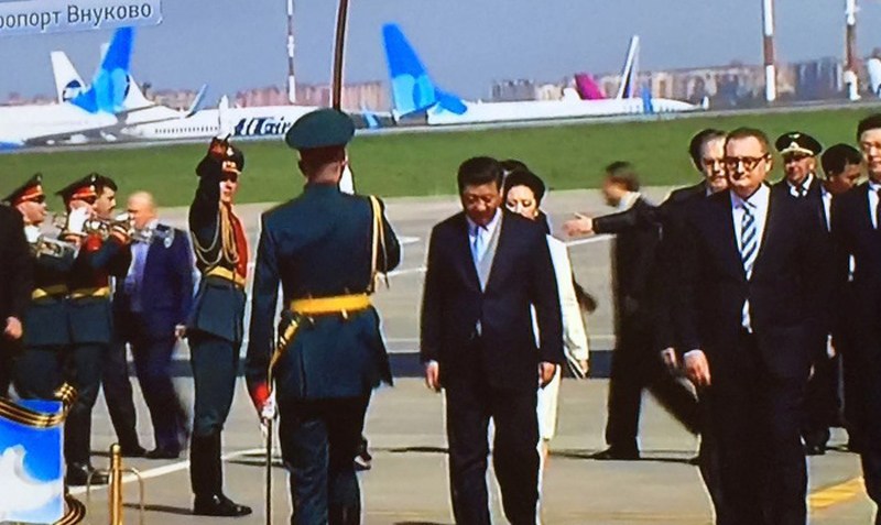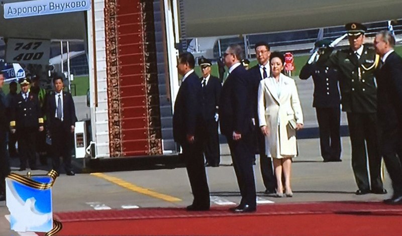 2015年5月8日,習近平和彭麗媛乘專機抵達俄羅斯首都莫斯科。
