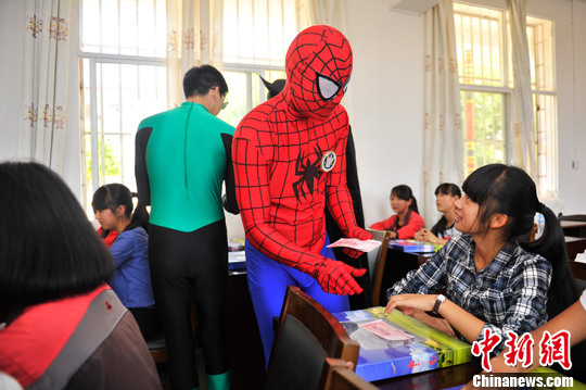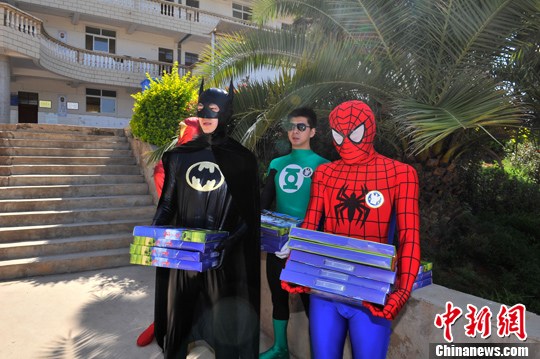 5月29日,在六一兒童節(jié)來臨之際,祥鵬航空的安全員變身超級英雄,來到云南省昆明市晉寧縣的學(xué)校,為長期資助的困難學(xué)生送上兒童節(jié)禮物。中新社發(fā) 劉冉陽 攝  5月29日,在六一兒童節(jié)來臨之際,祥鵬航空的安全員變身超級英雄,來到云南省昆明市晉寧縣的學(xué)校,為長期資助的困難學(xué)生送上兒童節(jié)禮物。