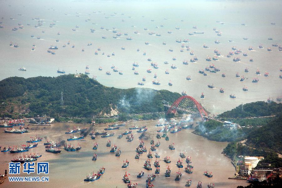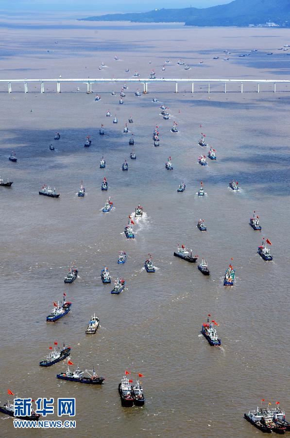 9月16日,浙江省舟山市沈家門漁港的漁船出港經過朱家尖大橋開赴漁場。當日,為期3個半月的東海伏季休漁結束,眾多漁船劈波斬浪,開往漁場。   新華社發(fā)(華志波 攝)