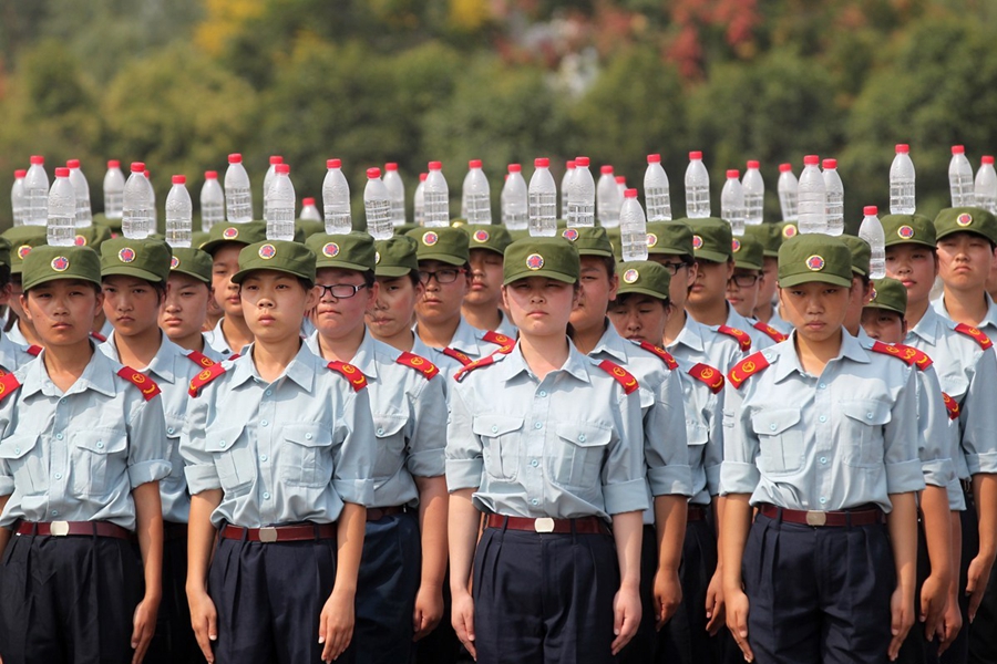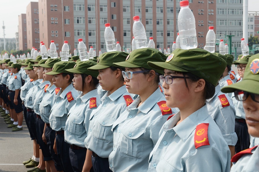 2015年9月17日,河南鄭州航空工業管理學院進行新生軍訓,記者軍訓現場發現,該院在站軍姿、踢正步等軍訓項目上,引入卷尺、純凈水瓶等“裝備”,而且為“準空姐”訓練的科目中,還增加了如何盤發等項目。圖為2015年9月17日,鄭州航空工業管理學院的新生在頭頂礦泉水瓶站軍姿。