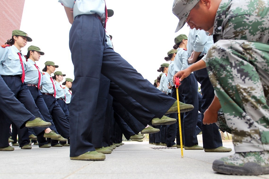 “以前上初中和高中都進行過軍訓,但像這樣每一個動作都有硬性指標的還是第一次,難度確實大。頂著瓶子的時候,開始還好,后來稍不留神瓶子就容易掉下來。”一位新生說。圖為2015年9月17日,鄭州航院的“準空姐”們正在軍訓,踢正步卷尺測量。