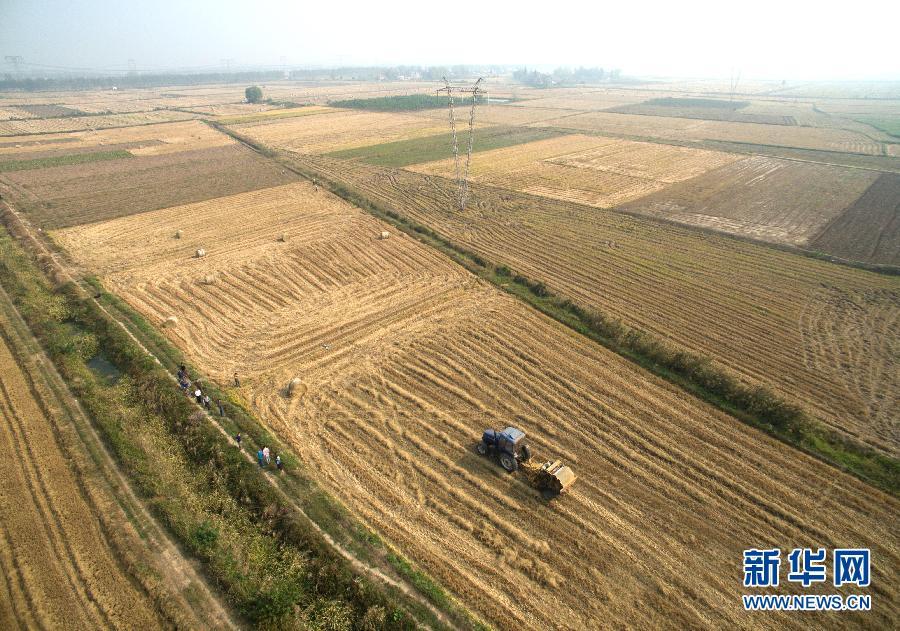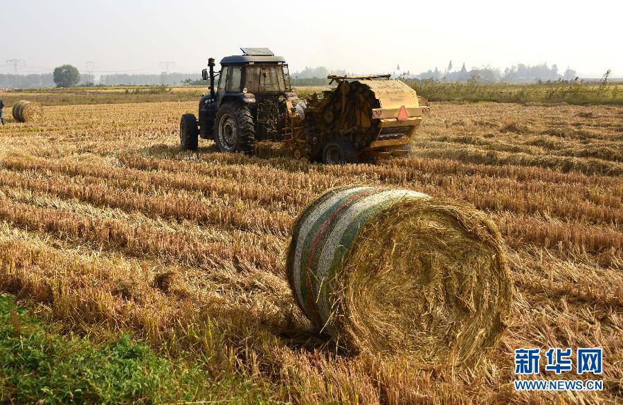 湖北省荊州市的一處農田在開展綜合利用秸稈收儲作業(10月22日攝)。