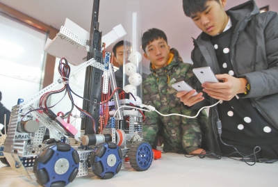 據鄭州二中PRCC科技代表隊指導老師吳鵬起介紹,比賽時,機器人們要從不同方向進入賽場,通過撞擊將球撞下來,然后“搶著”收球,并放入不同高度的球桶內,再將球桶推至固定區域。最終,得分最高者獲勝。“我們的機器人的動作流暢自如。外國裁判說我們的設計完美,非常棒”!(記者 譚萍文 許俊文/攝影)