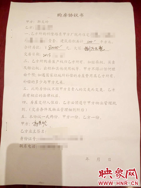 現場的居民向記者出示了當時的一份購房協議書,房屋售賣甲方的一欄赫然寫著“郭炎嶺”的名字。