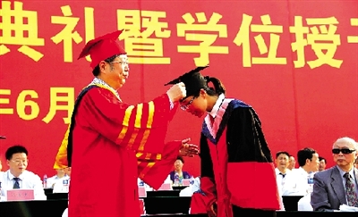 鄭州大學校長劉炯天在畢業典禮上為學子撥穗