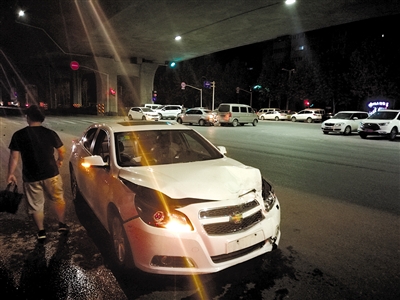 當日凌晨1時10分,記者現場看到,南三環南半幅下橋口處,由西向東約30米的路面上布滿車身碎片,一輛白色雪佛蘭轎車停靠在最右側快車道上,車前臉已凸起,主副駕駛室的安全氣囊均已彈出,車輛仍處于啟動狀態。