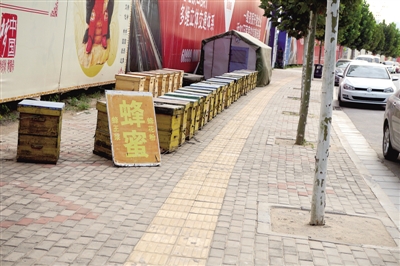 昨日上午,市民致電本報稱,啟福大道與南水北調渠北200米處,啟福中華小區北門口的人行道上,有人擺放了30多箱蜜蜂,不僅占道,不時飛出的蜜蜂還侵擾行人。