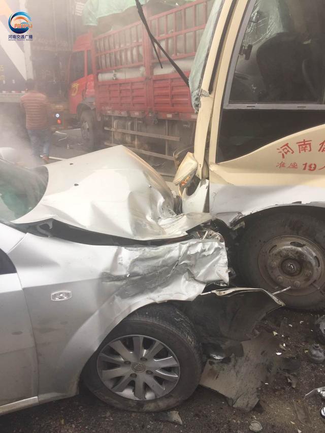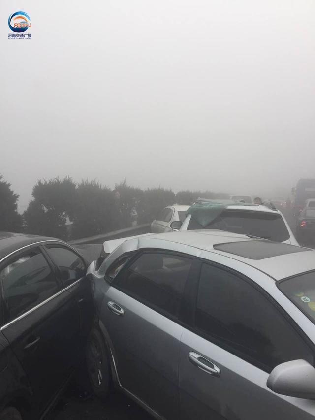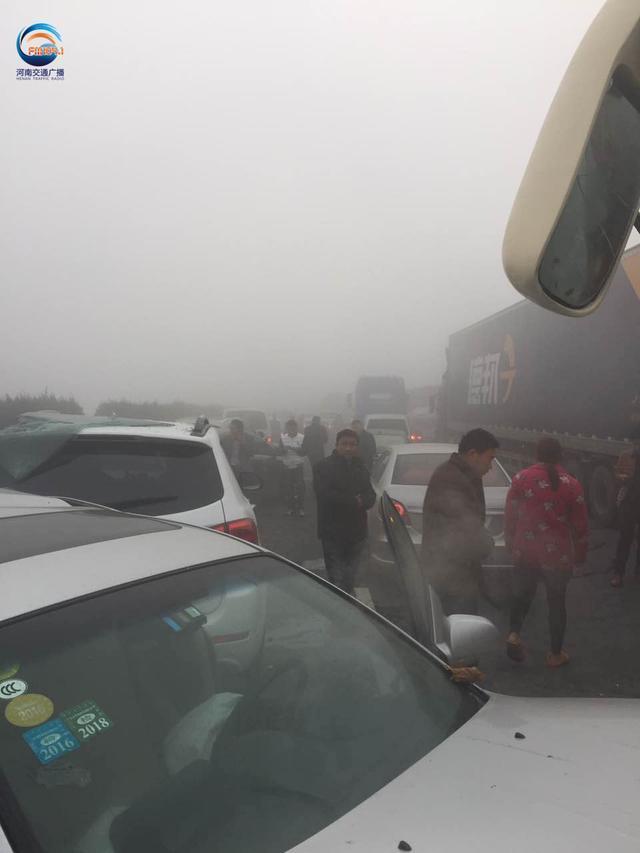 據現場郭先生描述:大概有4輛貨車,1輛中巴車,4輛私家車連環追尾,他就在這幾輛事故車后方,當時受大霧影響,能見度50米左右,前方堵車,結果這幾輛車都沒剎住,直接相繼撞上了,郭先生說“幸虧當時我車速不算快,及時把車剎住,不然前方就是一輛貨車,撞上去的話后果不堪設想,現在我的手都是抖的,太恐怖了”