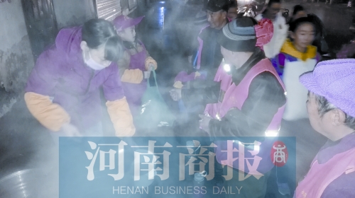 剛開始,她和隊友在鄭大一附院對面的立交橋下發粥,后來她就在西十里鋪84路公交站臺旁設了發粥點?,F在,他們的愛心團隊有46人,開設了四個發粥點,另外兩個是姚寨發粥點和冉屯路電廠路口發粥點。