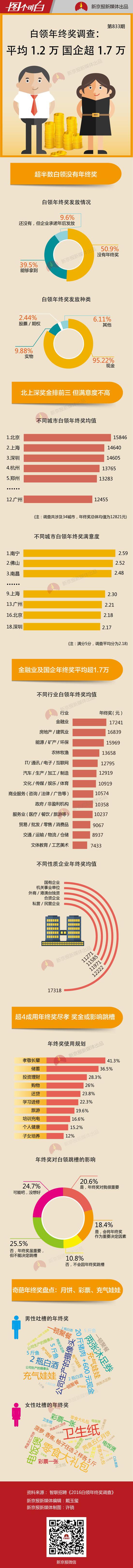 春節將至,“年終獎”又成了眾人關注的話題。近日,智聯招聘發布《2016白領年終獎調查》,調查通過對11526份有效問卷分析顯示,涉及的34城市年終獎總體均值為12821元。其中,北京最高,為15846元,上海和深圳次之。不過,三個城市的白領對年終獎的滿意度并不是很高。