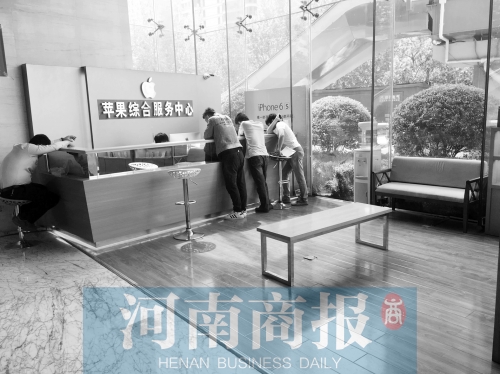 昨天上午,河南商報記者來到了升龍大廈一樓。該手機維修點有多處“蘋果”的標志,柜臺里也全是蘋果手機以及相關配套產品,有兩個消費者在維修蘋果手機。