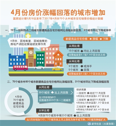 國家統(tǒng)計局城市司高級統(tǒng)計師劉建偉解讀稱,從環(huán)比看,4月份70個城市中有23個城市新建商品住宅價格漲幅比上月回落,比3月份增加13個;7個城市由上月上漲轉(zhuǎn)為持平或下降;3個城市房價降幅擴大。