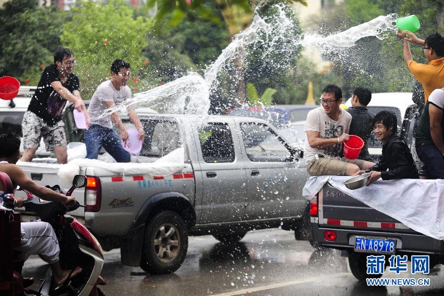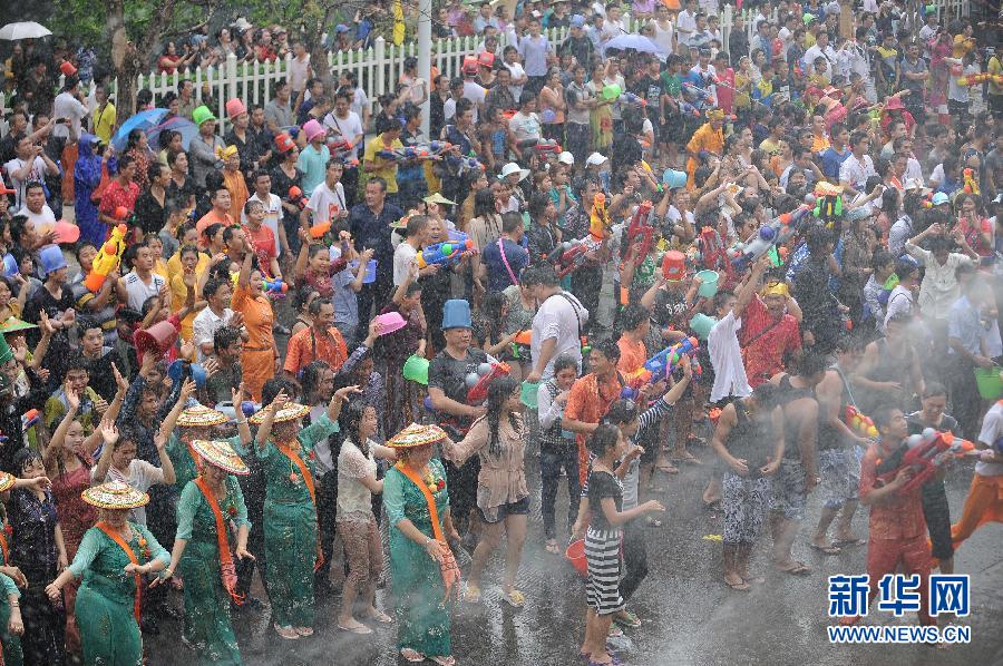 4月12日,當地群眾在德宏芒市體驗潑水狂歡。當日,云南省德宏傣族景頗族自治州繼續舉行2013年國際潑水狂歡節,各族群眾和游客歡聚在德宏芒市廣場狂歡潑水,祈福吉祥平安。 新華社記者張可任 攝