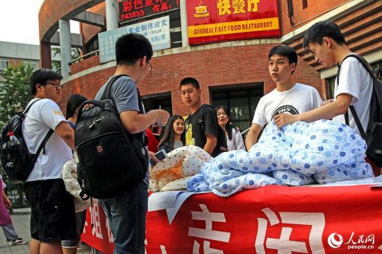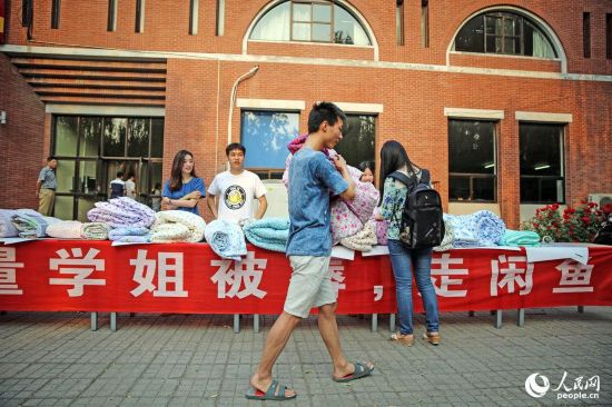 2015年05月31日,北京,清華大學大三學生小龍在宿舍樓旁擺起了攤位,一則“大量畢業學姐被褥”的廣告語,引發大量學子圍觀。2015年05月31日,北京,清華大學大三學生小龍在宿舍樓旁擺起了攤位,一則“大量畢業學姐被褥”的廣告語,引發大量學子圍觀。