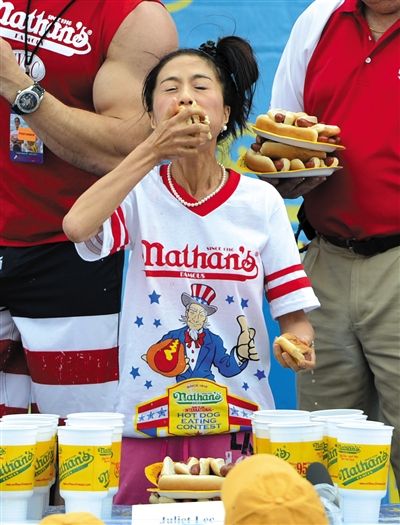7月4日,紐約舉行吃熱狗大賽,參賽選手正大嚼熱狗。吃熱狗競賽是紐約康尼島慶祝獨立日的一項傳統趣味活動。新華社發