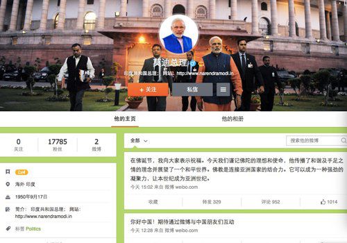 據媒體報道,莫迪計劃于本月訪問中國。他也成為又一位開展“微博外交”的外國國家領導人。此前,已經有4個國家的領導人開通了新浪微博,其中澳大利亞前總理陸克文是第一位,委內瑞拉總統尼古拉斯·馬杜羅和英國首相卡梅倫均在2013年開了微博,以色列前總統西蒙·佩雷斯于2014年開通。