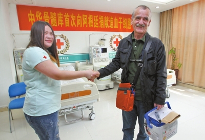 4月18日14時44分,黃發碧眼的志愿者喬治(英文全名:GeorgesJeanMarianelli),走進河南省腫瘤醫院造血干細胞采集室,徑直走到病床邊,向正躺在病床上采集造血干細胞的河南姑娘武佳微笑示意,走上前去說“你好”,并為她豎起大拇指。幾分鐘后,病床邊的造血干細胞采集機停止運轉,這位26歲的河南姑娘捐獻的199毫升造血干細胞混懸液,被醫護人員小心翼翼地取下……這份飽含河南大愛的“生命種子”,將搭乘飛機,輾轉被送到萬里之外的阿根廷,為一名8歲白人兒童送去生命希望。