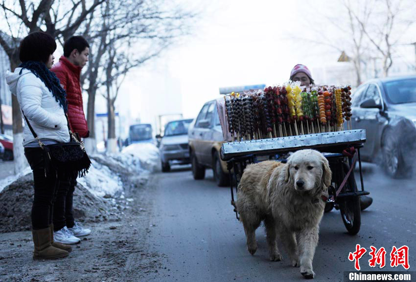 2月6日,在長春市一條繁華的街路上,一只小狗幫助身殘主人拉車賣冰糖葫蘆,成為長春冬日街頭一道感人的風景線。據主人介紹,雖然自己身殘且貧窮,但并不想靠別人救濟度日,因此學會了制作冰糖葫蘆的手藝,并以此自食其力。而他養的這條小狗“大黃”也是對主人不離不棄,每日都會幫助主人拉車外出謀生。圖為小狗拉著主人的糖葫蘆車走在繁華的街道上。張瑤 攝