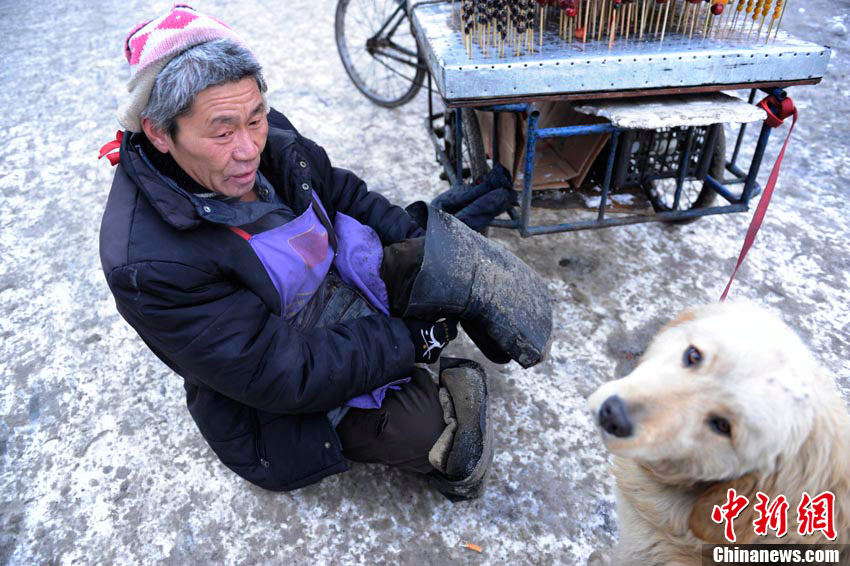 2月6日,在長春市一條繁華的街路上,一只小狗幫助身殘主人拉車賣冰糖葫蘆,成為長春冬日街頭一道感人的風景線。據主人介紹,雖然自己身殘且貧窮,但并不想靠別人救濟度日,因此學會了制作冰糖葫蘆的手藝,并以此自食其力。而他養的這條小狗“大黃”也是對主人不離不棄,每日都會幫助主人拉車外出謀生。圖為主人在賣冰糖葫蘆時,小狗乖乖的守在車旁。張瑤 攝