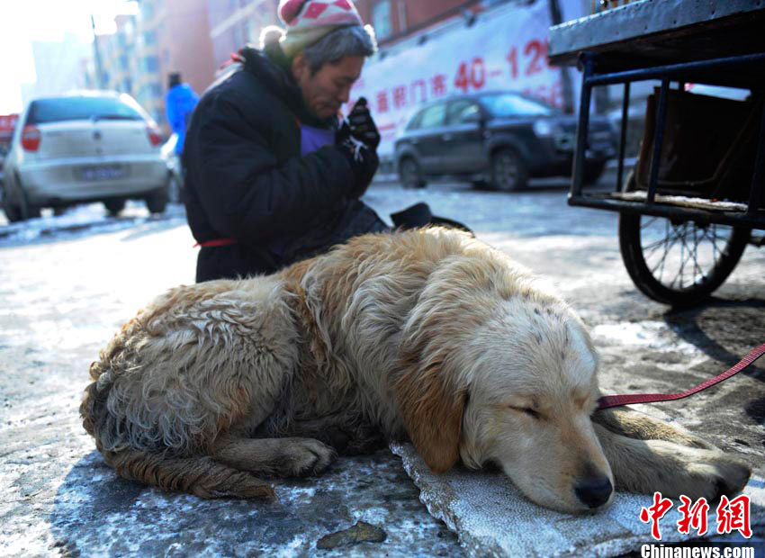 2月6日,在長春市一條繁華的街路上,一只小狗幫助身殘主人拉車賣冰糖葫蘆,成為長春冬日街頭一道感人的風景線。據主人介紹,雖然自己身殘且貧窮,但并不想靠別人救濟度日,因此學會了制作冰糖葫蘆的手藝,并以此自食其力。而他養的這條小狗“大黃”也是對主人不離不棄,每日都會幫助主人拉車外出謀生。圖為主人走累了抽根煙歇息的時候,小狗也在旁邊小憩一下。張瑤 攝