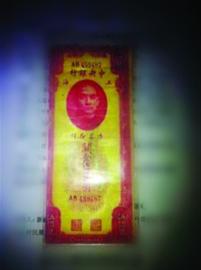 昨日上午9時許,在鐵西區永樂附近的亢女士,在網上發出一張照片,上面是用透明塑料袋包裝的“紙幣”,紙幣上畫有孫中山頭像,從右至左寫著中央銀行四個字,接著是用繁體字寫下的面值“五百萬”元,紙幣下還有一行小字寫著“民國三十六年”。